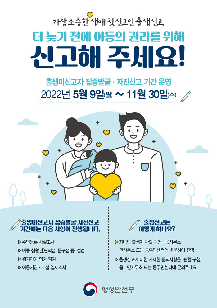 출생 미신고자는 교육, 의료 등 각종 제도의 사각지대로 방치되고 아동학대로 이어질 수 있다는 문제가 지속적으로 제기되고 있다. 이에 행정안전부는 출생 미신고아동을 집중적으로 발굴하고 출생 미신고자의 자진신고를 유도하기 위해 전국적으로 출생 미신고아동 집중발굴·자진신고 기간을 운영한다.