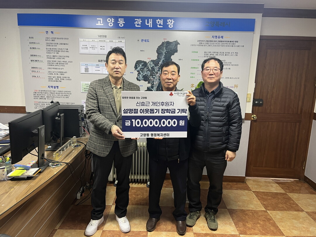 [부자동네타임즈 = 김인수 기자] 고양특례시 덕양구 고양동은 지난 2일, 고양시 편의시설 관련 주민협의체 신효근 회장이 저소득층 학생 지원에 써달라며 장학금 1,000만 원을 기탁했다고 밝혔다.