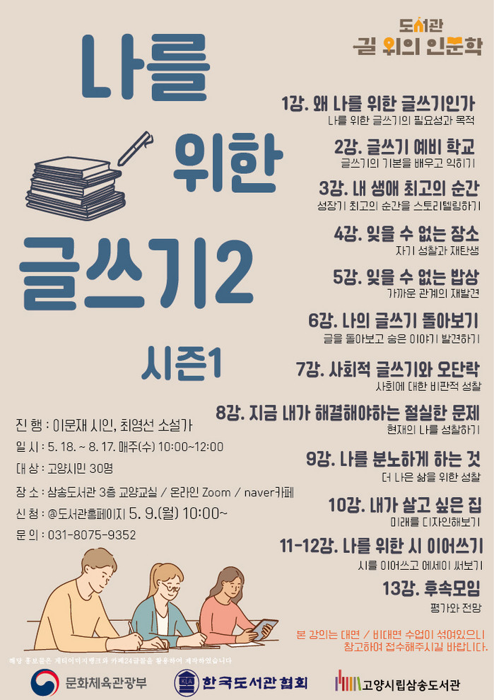 ‘나를 위한 글쓰기2’는 시즌1과 시즌2로 나뉘어 운영되며 시즌2는 7월에 시작될 예정이다. 각 시즌마다 총 13강으로 진행되며, 온라인(Zoom)과 대면강의가 섞여 진행된다.
