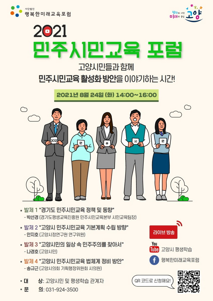 [부자동네타임즈 김인수기자] 고양시가 8월 24일(화) 오후 2시 고양시 민주시민교육 활성화 방안 모색을 주제로 2021 고양시 민주시민교육 포럼을 온라인으로 개최한다.