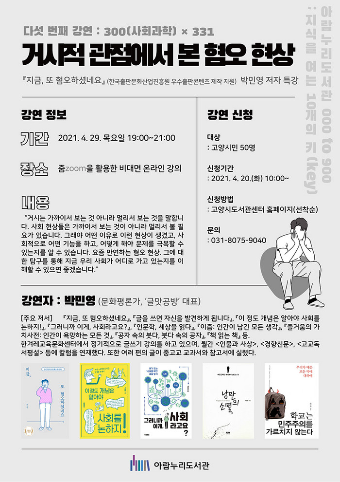 [부자동네타임즈 김인수기자] 고양시 아람누리도서관은 연속 기획 000 to 900 지식을 여는 10개의 키(key)의 다섯 번째 강연으로 ‘300 사회과학’ 분야 주제 강연, 거시적 관점에서 본 혐오 현상을 오는 29일 진행한다.
