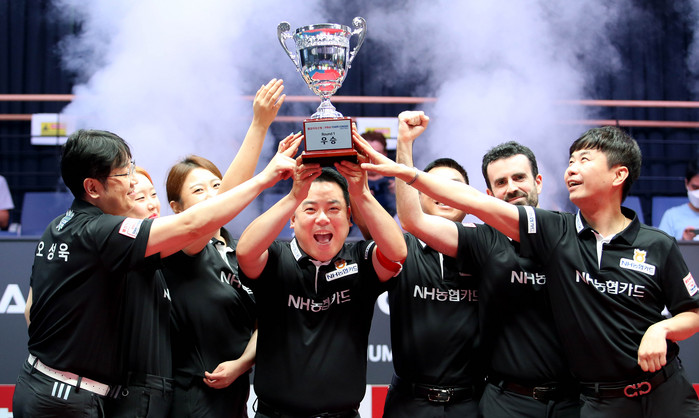 [부자동네타임즈 김인수기자] 지난 3일부터 경기도 고양시 ‘고양 킨텍스 PBA 스타디움’에서 9일동안 열린 ‘웰컴저축은행 PBA 팀리그 2023-2024’ 1라운드 최종일 경기서 NH농협카드는 하나카드를 세트스코어 4:1로 꺾고 1라운드 우승컵을 들어올렸다. 2위 크라운해태가 NH농협카드를 바짝 쫓았지만 NH농협카드는 경우의 수를 따질 필요 없이 승점3을 추가하면서 자력으로 우승을 확정, 5개 팀이 경쟁하는 포스트시즌에 가장 먼저 이름을 올리게 됐다. 1라운드를 마친 PBA 팀리그는 오는 16일부터 같은 장소에서 2라운드에 돌입한다.