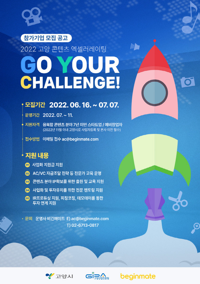 [부자동네타임즈 김인수기자] 고양산업진흥원(원장 오창희, 이하 진흥원)은 융복합 콘텐츠 분야 우수 스타트업을 육성하고자 ‘2022년 고양 콘텐츠 엑셀러레이팅, GO YOUR CHALLENGE!’의 참가기업을 모집한다.
