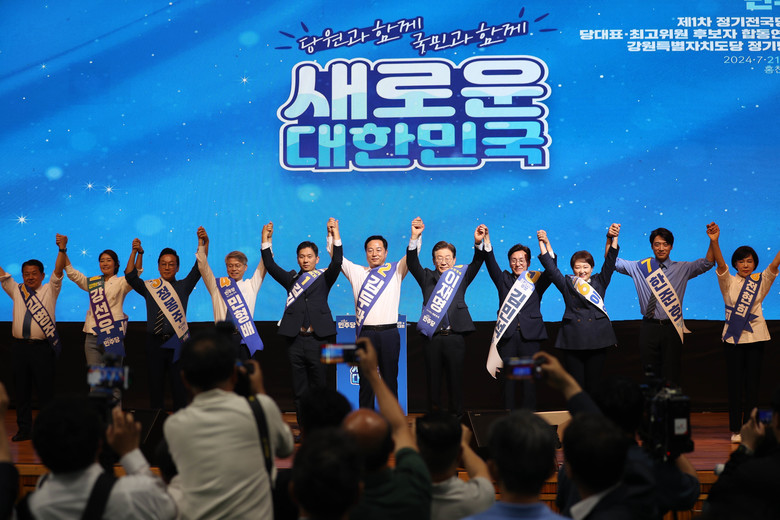 더불어민주당 새 지도부 선출을 위한 지역순회 경선 둘째 날인 21일 오전 강원 홍천군 홍천종합체육관에서 열린 합동연설회에서 3명의 당 대표 후보와 8명의 최고위원 후보가 손을 들어 올리며 당원들에게 인사하고 있다.