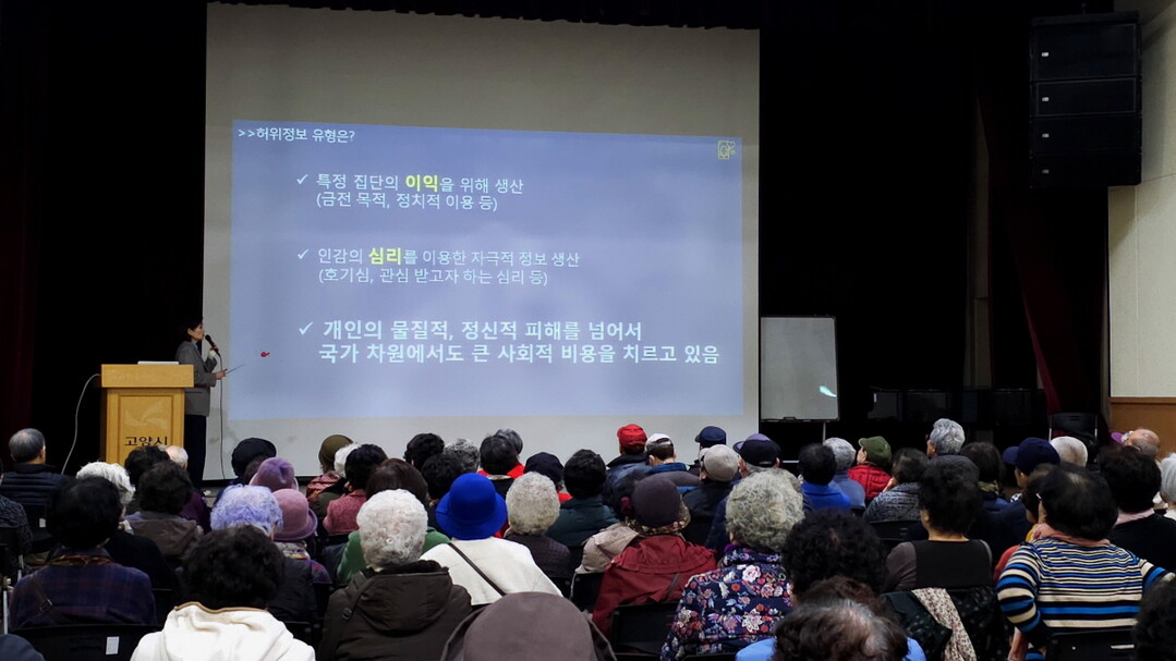 [부자동네타임즈 = 김인수 기자] 고양시일산노인종합복지관(관장 장기욱)은 지난 14일 복지관 대강당에서 이용회원 약 130명을 대상으로 생활밀착형 디지털 역량 교육인‘미디어 가짜뉴스 구별하기’특강을 진행했다.