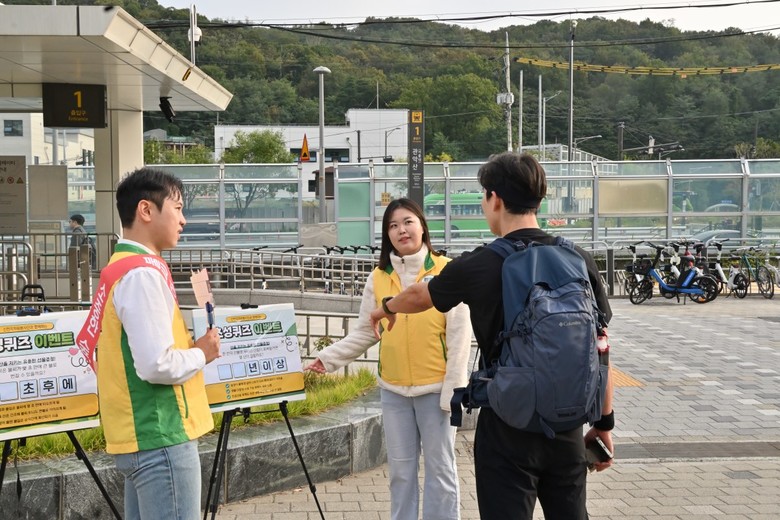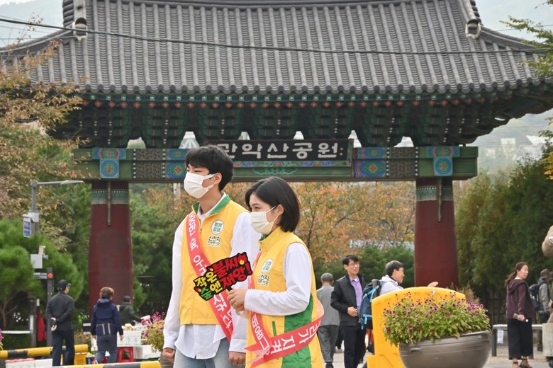 가을철 산불 위험이 증가한 가운데 신천지자원봉사단 동작지부(지부장 최중일·이하 동작지부)가 지난 25일 관악산역 부근에서 등산객들을 대상으로 산불 예방 캠페인을 진행했다.