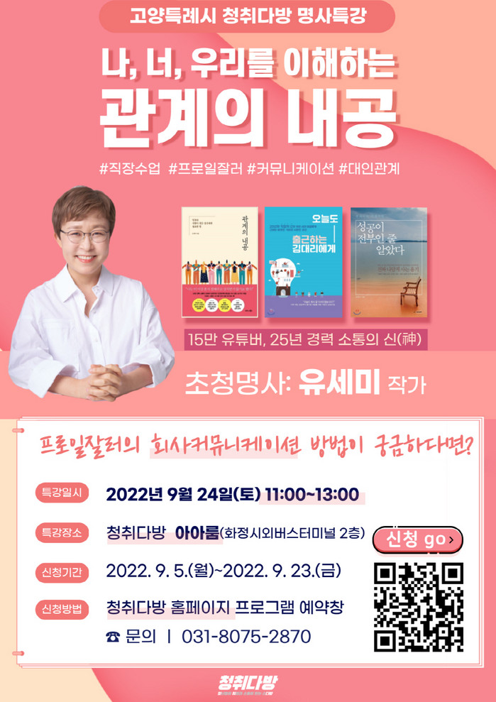 [부자동네타임즈 김인수기자] 고양특례시(시장 이동환)가 오는 24일 청년주간 특집 명사특강을 개최한다. 고양시 청년공간 청취다방이 주관하는 이번 명사특강은 삼성물산, 애경그룹에서 25년간 직장생활을 하며 다양한 유형의 사람들과 관계를 지혜롭게 맺어 온 유세미 작가를 초청해 진행된다.