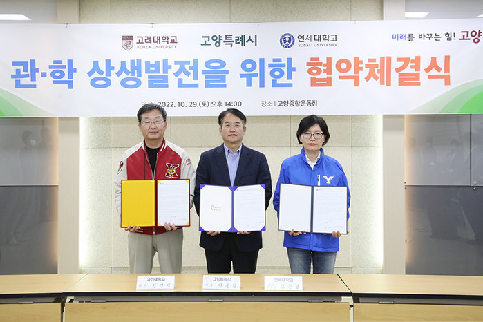 10월 29일 고양시 대화동 고양종합운동장에서 이동환 고양특례시장, 정진택 고려대학교 총장, 김은경 연세대학교 교학부총장이 관학상생을 위한 업무협약을 체결했다.