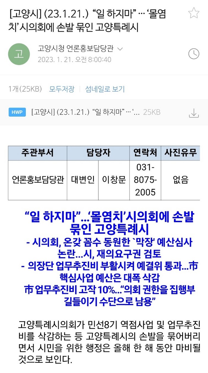 [부자동네타임즈 김인수기자] 금일 오전에 배포된 한 장의 고양특례시 보도자료가 설연휴 첫날 고양시를 시끄럽게 하고 있다.