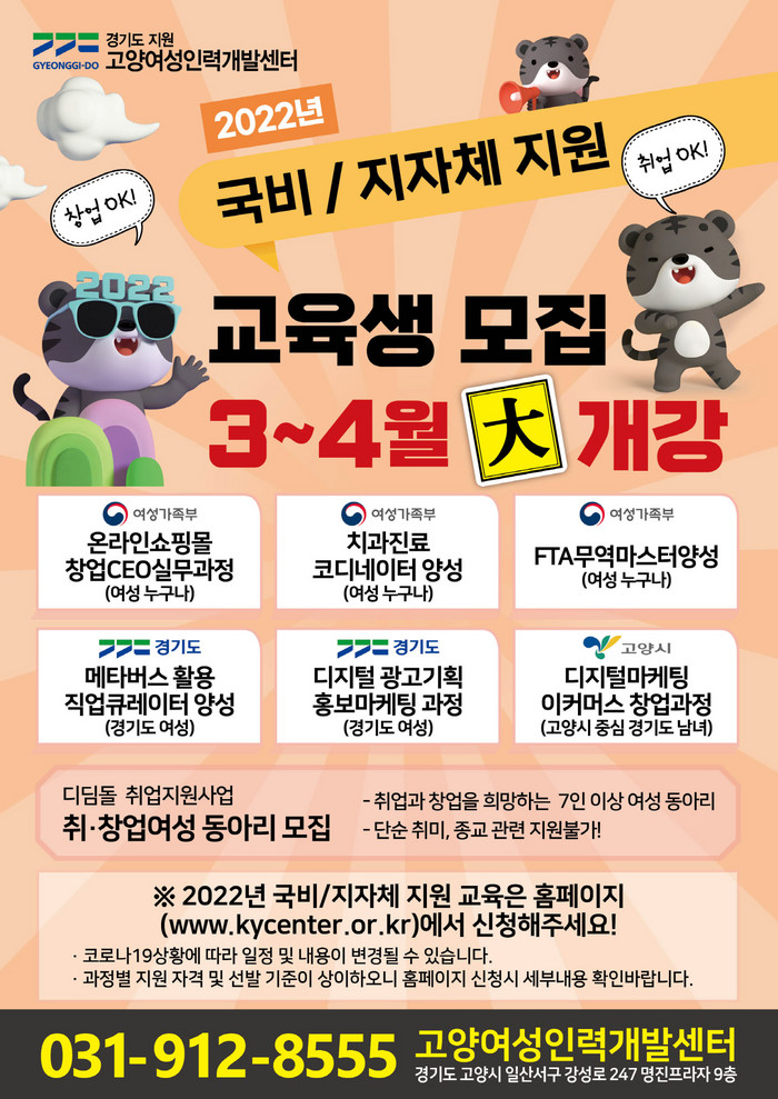 [부자동네타임즈 김인수기자] 고양시와 고양여성인력개발센터는 경제활동을 원하는 여성구직자들의 취·창업지원을 위한 2022년 상반기 국비지원 교육을 시작한다.