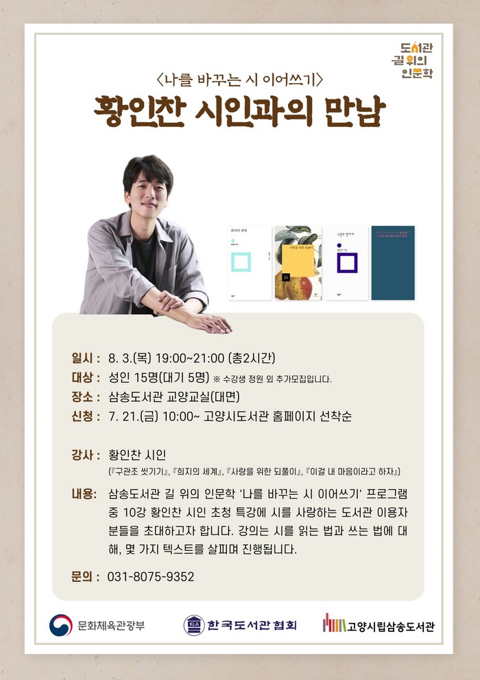 고양시립삼송도서관은 문화체육관광부가 주최하고 한국도서관협회가 주관하는 ‘길 위의 인문학’ 공모사업에 3년 연속 선정됐다. 도서관은 ‘길 위의 인문학’ 사업의 일환으로 지난 6월 1일부터 ‘나를 바꾸는 시 이어쓰기’ 수업을 운영하고 있다.