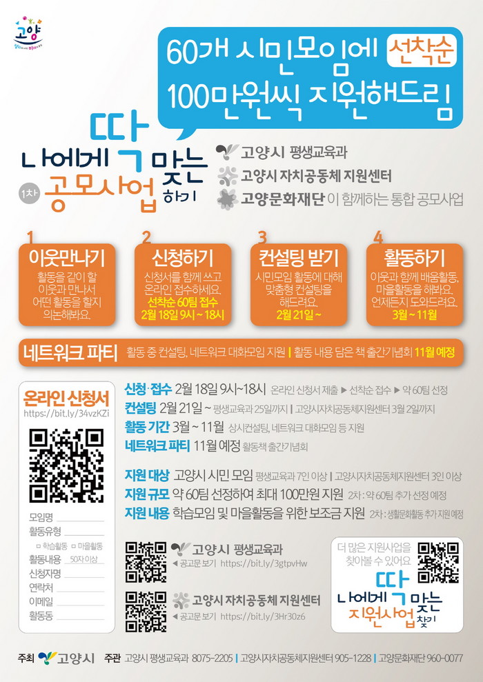 자세한 사항은 고양시 평생학습포털 공지사항과 자치공동체지원센터 공지사항을 통해 확인할 수 있다. 기타 궁금한 사항은 평생교육과로 문의하면 된다.