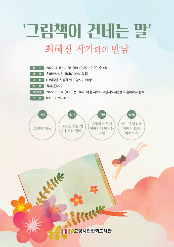 4월 5일부터 26일 까지 매주 화요일 오전 10시 30분부터 진행되는 이 프로그램은 그림책의 매력을 더 깊이 이해하고자 하는 시민이라면 누구나 참여할 수 있다.