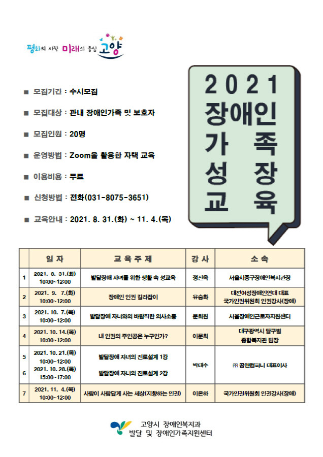 [부자동네타임즈 김인수기자] 고양시가 관내 장애인 가족과 그 보호자를 대상으로 ‘2021년 장애인가족 성장교육’을 비대면으로 진행한다.