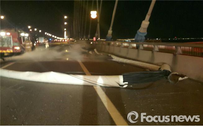 △ 지난 3일 오후 6시 12분 경기 평택시 서해대교 목포방면 행담도휴게소 전방 주탑에 불이 나 연결된 케이블이 끊어져 도로에 떨어져 있는 모습. <사진제공=경기도재난안전본부> |