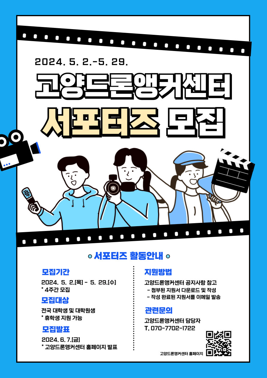 서포터즈는 홍보 활동을 적극적으로 수행할 수 있도록 위촉장과 소정의 원고료를 지원받으며, ▲드론 조종자 자격증 취득 ▲고양드론앵커센터 드론 전문가 교육 과정 수강 등을 지원받을 수 있다.