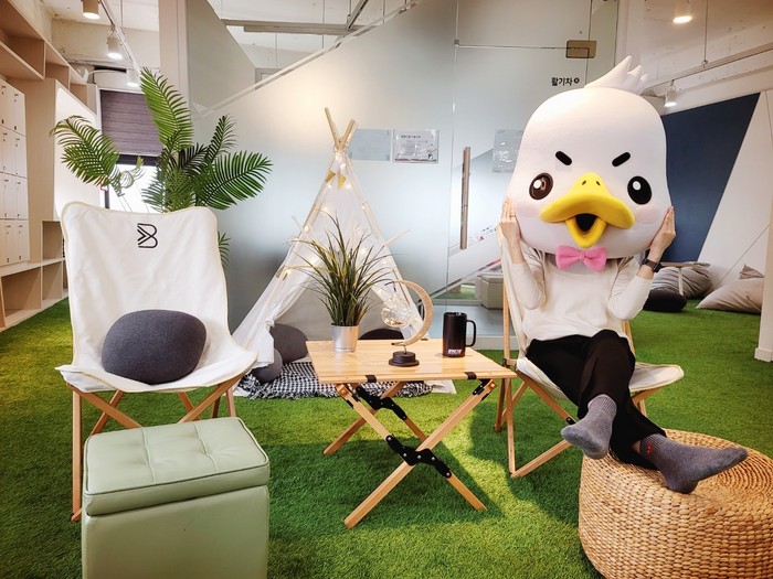 [사진설명] 청취다방 내 낭만캠핑존과 청취다방 마스코트 디디.