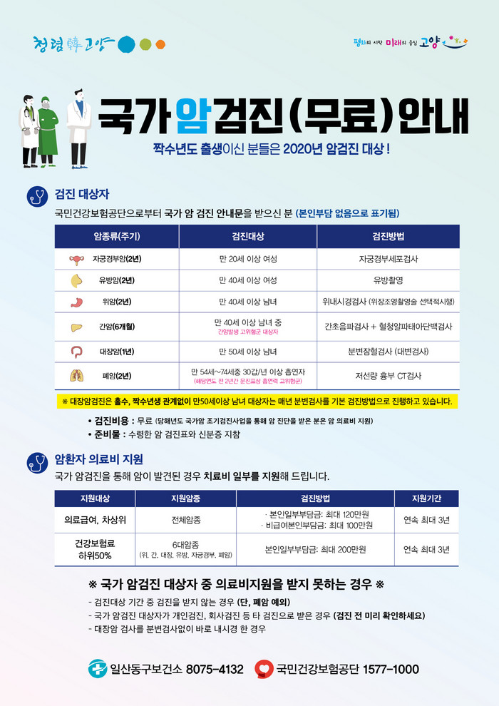2020년 국가암검진 사업 대상자는 의료급여수급권자 및 건강보험료 하위 50% 이하의 짝수년도 출생자로 위암, 유방암, 간암, 대장암, 자궁경부암, 폐암이 검진항목에 해당된다.