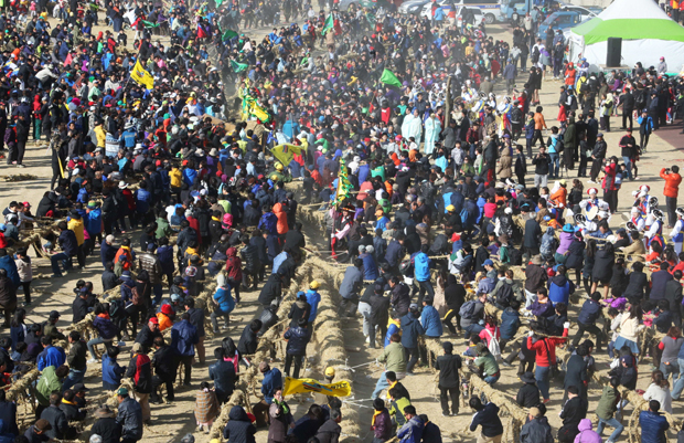 △ 충남 당진시의 기지시줄다리기가 유네스코 인류무형문화유산에 최종 등재됐다. 사진은 기지시줄다리기 행사를 진행하는 모 습. <사진제공=당진시청> |