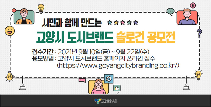 접수기간은 9월 10일(금)부터 9월 22일(수)까지이다. 슬로건 공모전 참여는 고양시 도시브랜드 홈페이지를 통해 할 수 있다. 기타사항은 고양시 도시브랜드 공모전 사무국에 문의하면 된다.