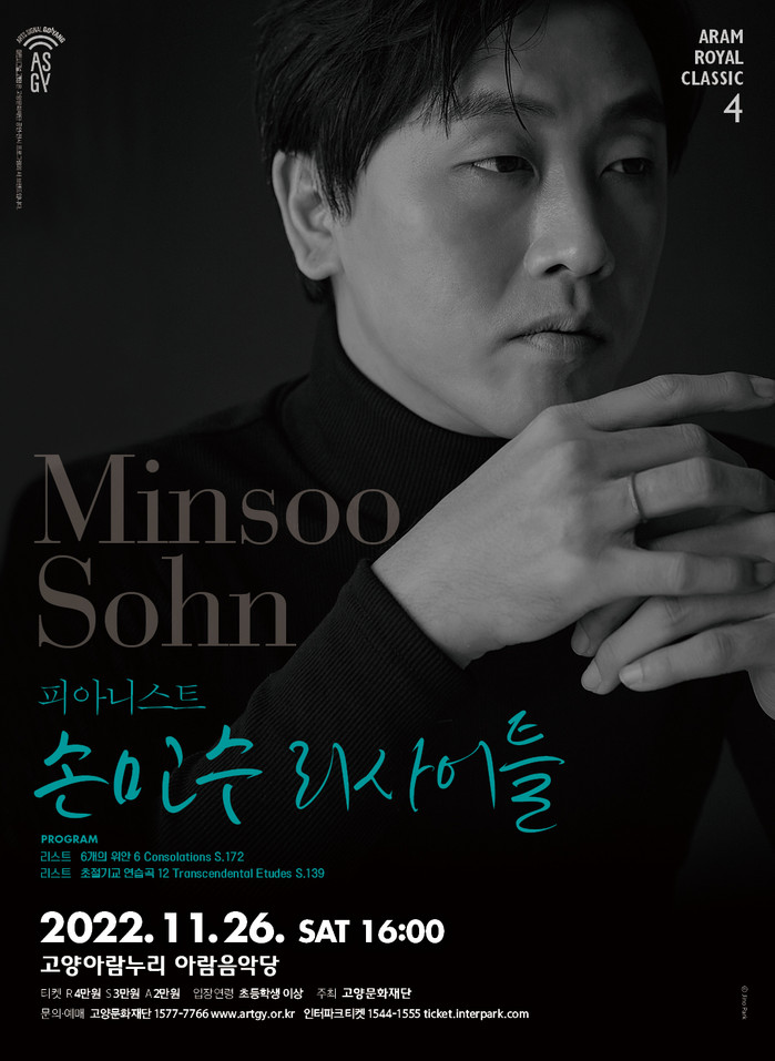 [부자동네타임즈 김인수기자] 고양문화재단(대표이사 정재왈)은 기획공연 ‘2022 아람 로열 클래식’ 네 번째 무대로 작곡가 리스트의 ‘6개의 위안’과 ‘초절기교 연습곡’으로 마련된 <손민수 리사이틀>을 오는 11월 26일(토) 고양아람누리 아람음악당에서 개최한다.