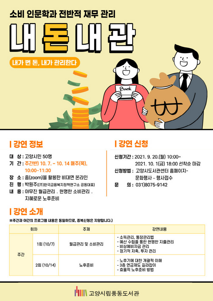 [부자동네타임즈 김인수기자] 고양시 풍동도서관이 오는 10월 7일(목)부터 10월 28일(목)까지 총 4회(매주 목요일)에 걸쳐 소비 인문학과 전반적인 재무 관리방법을 배울 수 있는 경제교육 프로그램을 온라인(Zoom)으로 진행한다.
