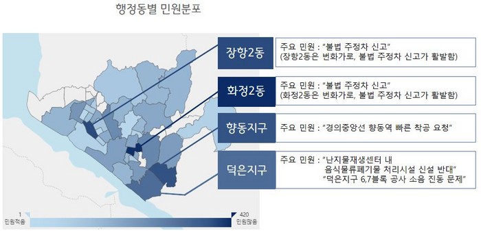 고양시 빅데이터 분석을 통해 확인한 행정동별 국민신문고 민원분포에서, 덕은지구가 포함된 행정동 대덕동의 민원건수는 3월 488건, 4월 405건, 5월 1,137건, 6월 1,524건, 7월 318건으로 전월대비 79% 감소하였다. 덕은지구의 국민신문고 민원이 5, 6월에 급증하였다가 7월 들어 다시 이전 수준으로 돌아간 것이다.