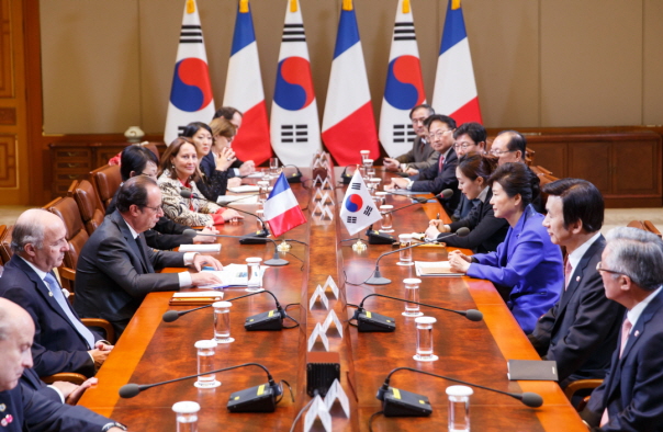 △ 박근혜 대통령과 프랑수아 올랑드 프랑스 대통령이 4일 청와대에서 열린 한불 정상회담에서 양국 우호협력에 대해 논의하고 있다. <사진제공=청와대>