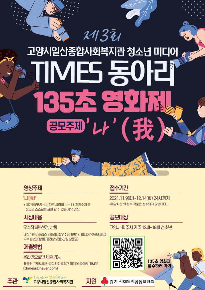 ‘135초 영화제-나(我)’영상 공모전은 2021년 12월 14일(화)까지 진행되며, 신청 및 자세한 사항은 고양시일산종합사회복지관 홈페이지에서 확인할 수 있다.