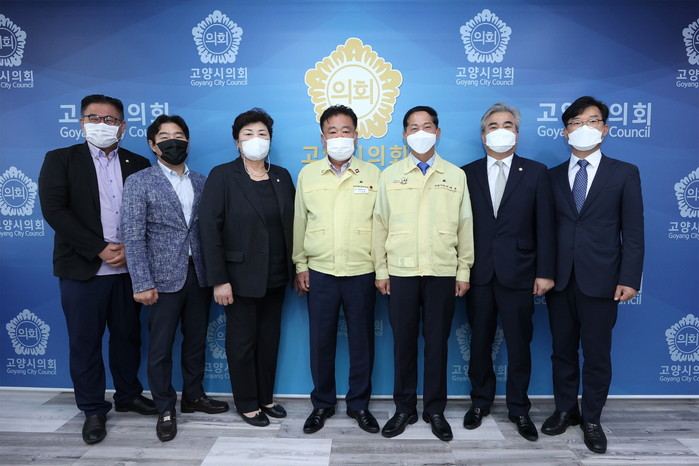 [사진 설명] 고양시의회의원과 이재준 고양시장(왼쪽부터 문재호 건설교통위원장, 김운남 환경경제위원장, 강경자 기획행정위원장, 이길용 고양시의회 의장, 이재준 고양시장, 정판오 의회운영위원회 부위원장, 정봉식 문화복지위원장)