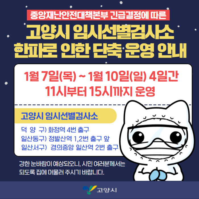 [부자동네타임즈 김인수기자] 고양시는 "한파특보가 내려진 1월 7일부터 10일까지 4일간 임시선별검사소 3곳의 운영시간을 오전 11시부터 15시까지로 조정한다."고 밝혔다.