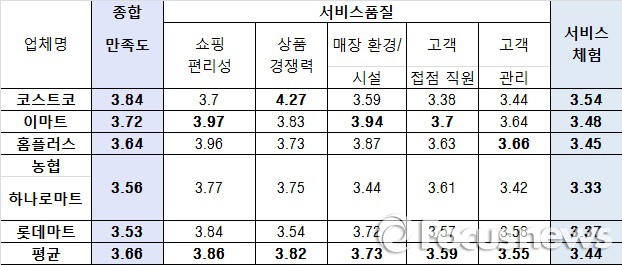 이어 이마트(3.72), 홈플러스(3.64), 농협하나로마트(3.56), 롯데마트(3.53) 순이다.