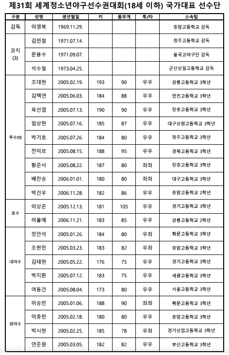 [부자동네타임즈 김인수기자] 대한야구소프트볼협회(회장 이종훈, 이하 협회)는 오는 9월 1일(금)부터 9월 10일(일)까지 대만 타이베이, 타이중)에서 개최되는 제31회 세계청소년야구선수권대회(18세 이하)에 참가할 청소년 국가대표 코칭 스태프와 선수를 최종 확정했다.