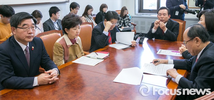 (서울=포커스뉴스) 이기권(왼쪽) 고용노동부 장관이 11일 오전 서울 여의도 국회에서 열린 새누리당 노동특위·환경노동위원회 연석회의에 참석해 이인제 노동시장선진화특위 위원장의 모두발언을 경청하고 있다.