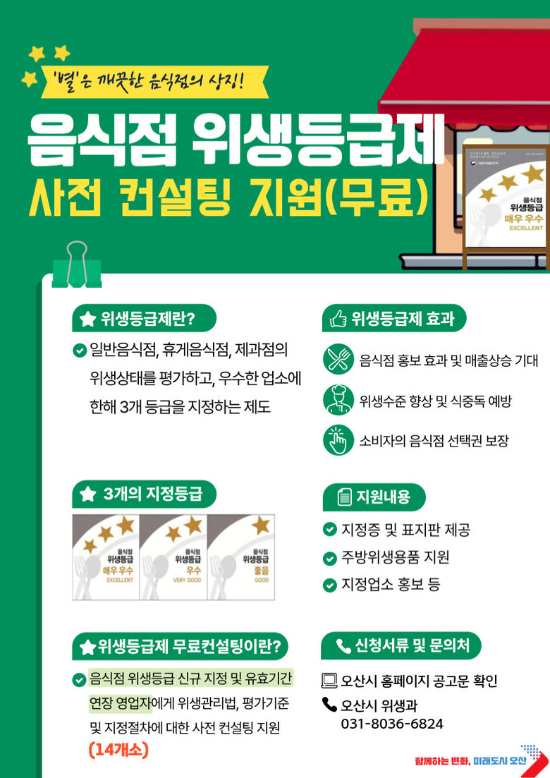 현재 오산시에는 231개소의 위생등급 지정 업소가 운영되고 있으며, 위생등급 지정을 받은 업소에는 위생등급 지정서와 지정 현판이 제공되고 주방 위생용품 지원, 지정업소 홍보 등 다양한 혜택이 주어진다.