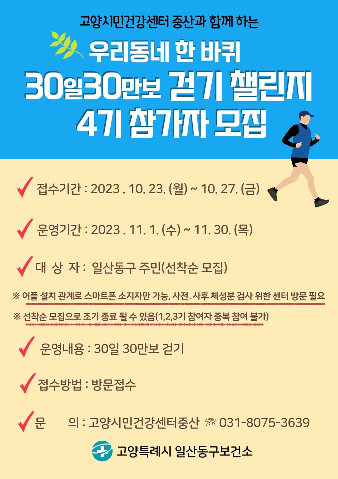 [부자동네타임즈 = 김인수 기자] 고양특례시 일산동구보건소에서 운영하는 고양시민건강센터 중산이 11월부터 지역주민의 올바른 신체활동 습관 형성을 위해 걷기 프로그램 슬기로운 직장생활 더 걸으리와 우리동네 한 바퀴 30일 30만보 걷기챌린지를 운영한다.