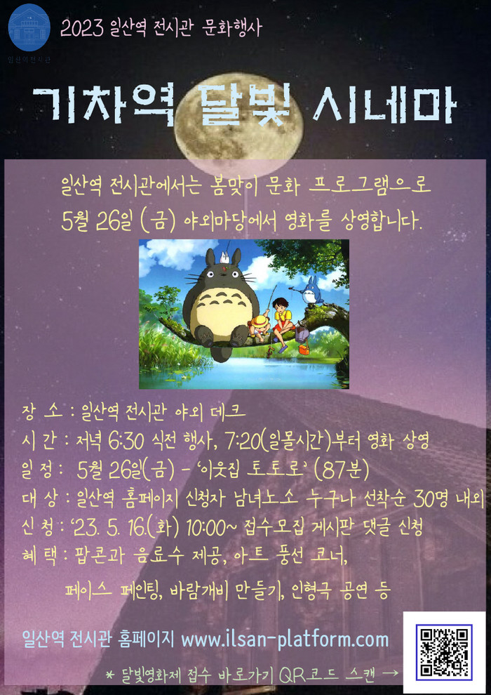 [부자동네타임즈 김인수기자] 고양특례시(시장 이동환)와 (사)고양시새마을회(회장 김창규)에서 위탁 운영하고 있는 고양 일산역 전시관에서는 오는 5월 26일(금) 전시관 야외마당에서 ‘기차역 달빛 시네마’를 운영한다.