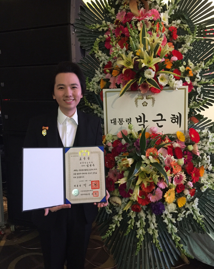 | △ 팝페라테너 임형주가 지난 4일 오후 2시 서울시 강남구 대치동에 위치한 컨벤션 벨라지움 3층 그랜드볼룸에서 개최된 ‘UN 세계자원봉사자의 날 기념식’에서 해외순방 중이던 박근혜 대통령을 대신한 정종섭 행정자치부장관으로부터 최연소의 나이(만 29세)로 ‘대통령표창’을 수여받았다.<사진제공=(주)디지엔콤&유니버설뮤직> |