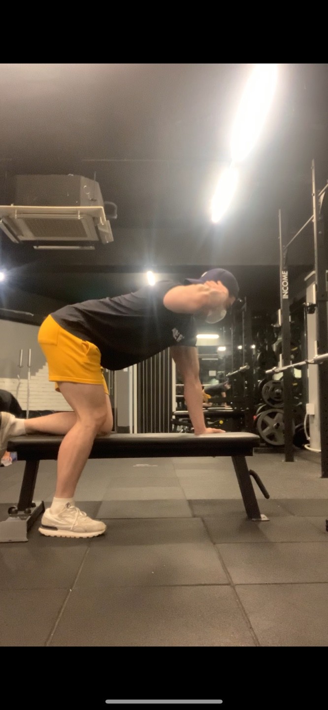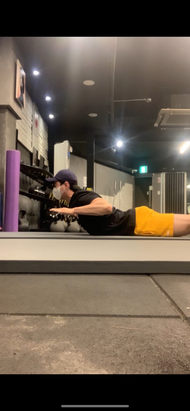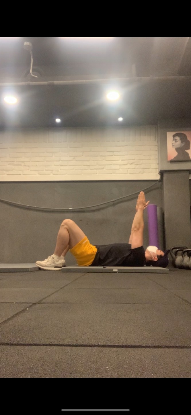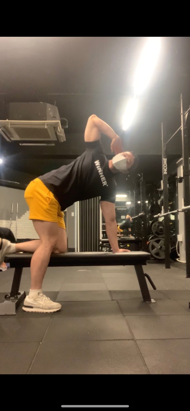 상체를 세우며 팔꿈치를 옆구리에 닿는다고 상상하며 당겨준다.