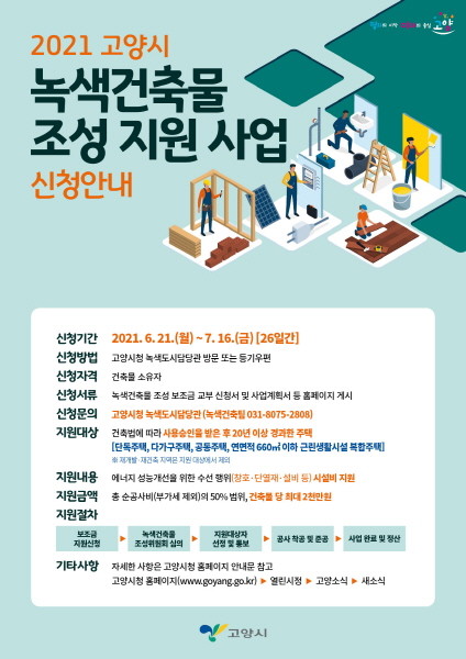 [부자동네타임즈 김인수기자] 고양시가 노후주택의 에너지효율 향상과 시민의 주거환경 개선을 위해 ‘2021년 녹색건축물 조성 지원 사업’ 대상자를 오는 7월 16일까지 모집한다.