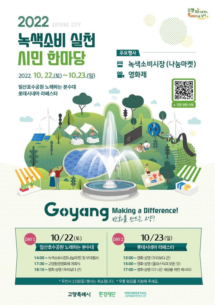 [부자동네타임즈 김인수기자] 고양특례시(시장 이동환)가 10월 22일부터 10월 23일까지 일산호수공원 노래하는 분수대와 라페스타 롯데시네마에서 ‘녹색소비 생활실천 시민한마당'을 개최한다.
