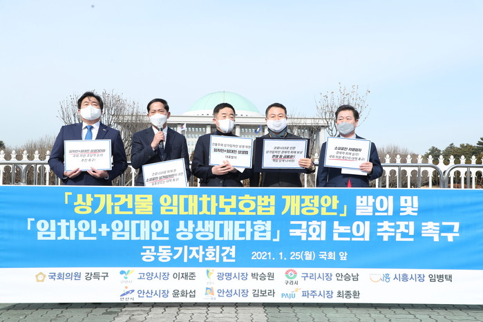 [부자동네타임즈 김인수기자] 이재준 고양시장은 지난 25일 국회 앞에서 강득구 국회의원, 경기도 4개 지자체장과 함께 기자회견을 열고 임대료 감면법(상가건물 임대차보호법 일부개정안) 제정을 촉구했다.