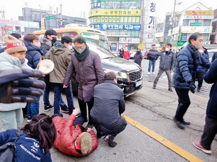 [사진설명] 이동환 고양특례시장 차 앞에서 주민 한 명이 차 앞에 드러누워 시위를 했다.