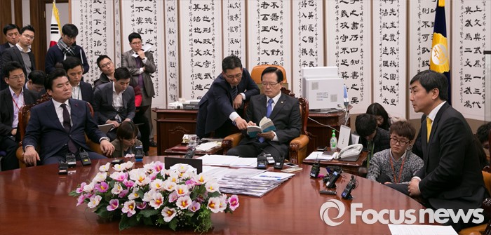| △ 9일 오전 서울 여의도 국회에서 정의화 국회의장 주재로 진행된 정기국회 및 임시국회 의사일정 등 현안 논의를 위한 여야 원내지도부 회동에서 정(가운데) 의장이 여야 원내대표 발언을 듣던 중 헌법 및 국회법 관련 책을 살펴보고 있다. <사진제공=포커스뉴스> |
