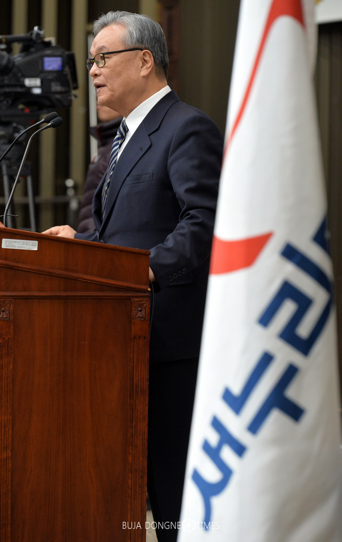 1일 오전 서울 여의도 국회 제4회의장에서 열린 새누리당 의원총회에 참석한 인명진 비상대책위원장이 모두발언하고 있다. 새누리당은 이날 의원총회에서 새 당 명칭 등을 논의했다. 2017.02.01.