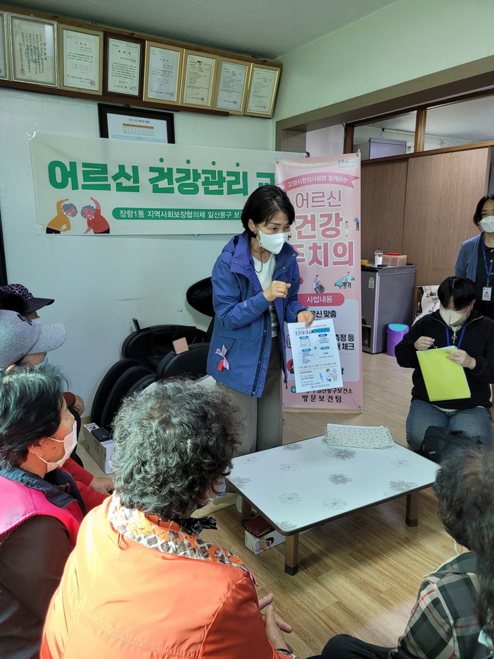“어르신 건강 교실”사업은 장항1동 거주하시는 어르신을 대상으로 혈당, 혈압 등 기초 건강 체크를 하고, 만성질환에 대한 예방 관리 교육, 신체활동, 영양 등 건강 상담도 함께 진행했다