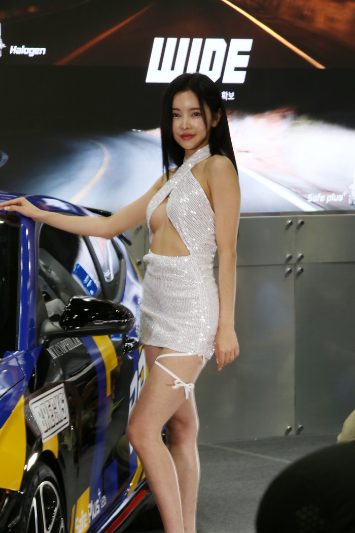 [사진설명] '2022 오토살롱위크' 배우겸 모델 신새롬 차량 앞에서 쭉뻗은 각선미를 선보이고 있다.