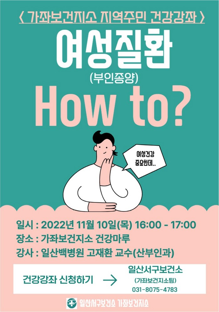 [부자동네타임즈 김인수기자] 고양특례시(시장 이동환) 일산서구보건소 가좌보건지소에서 11월 10일(목) 16시에 가좌보건지소에서 ‘여성질환(부인종양)’ 건강강좌를 운영한다. 강의는 일산백병원 고재환 교수가 맡는다.