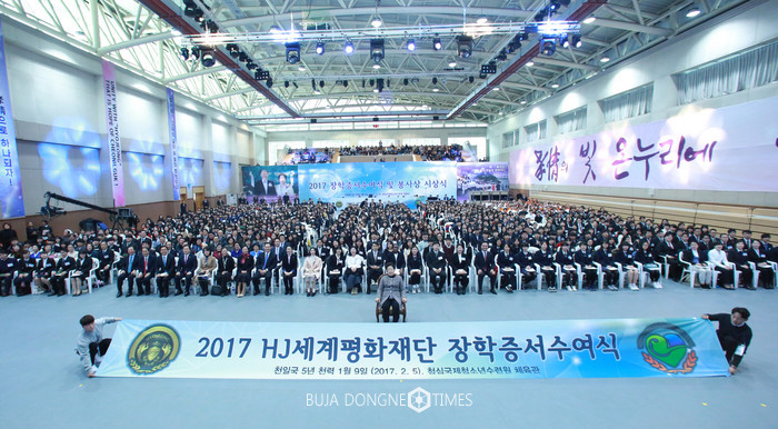 5일 오후 경기도 가평 청심국제청소련수련원 대강당에서 열린 ‘재단법인 효정세계평화재단 2017 장학증서 수여식 및 봉사상 시상식’에서 한학자 (맨 앞줄 가운데)총재를 비롯한 참석자들이 기념촬영을 하고 있다. 이날 행사에는 전체 장학생을 대표하여 한국, 미국, 영국, 독일, 프랑스, 오스트리아, 브라질, 멕시코, 니카라과, 일본, 대만, 네팔, 말레이시아, 호주, 뉴질랜드, 솔로몬 제도, 러시아, 루마니아, 시리아, 이스라엘, 가나, 르완다, 우간다, 잠비아, 카메룬 등 전 세계에서 88개국 800여명의 학생수여자들이 참석했다. 2017.02.05.(사진=재단법인 효정세계평화재단 제공)