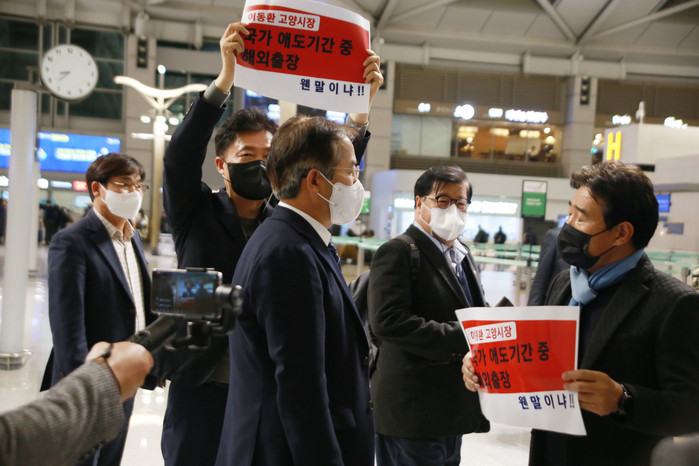 [사진설명] 지난 5일 인천국제공항에서 민주당 의원들이 규탄 피켓시위를 하고 있다.